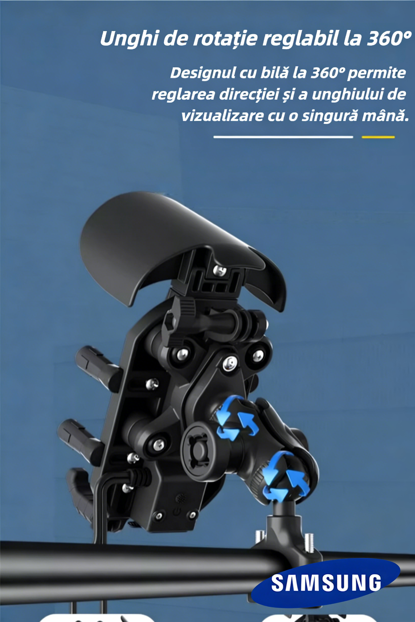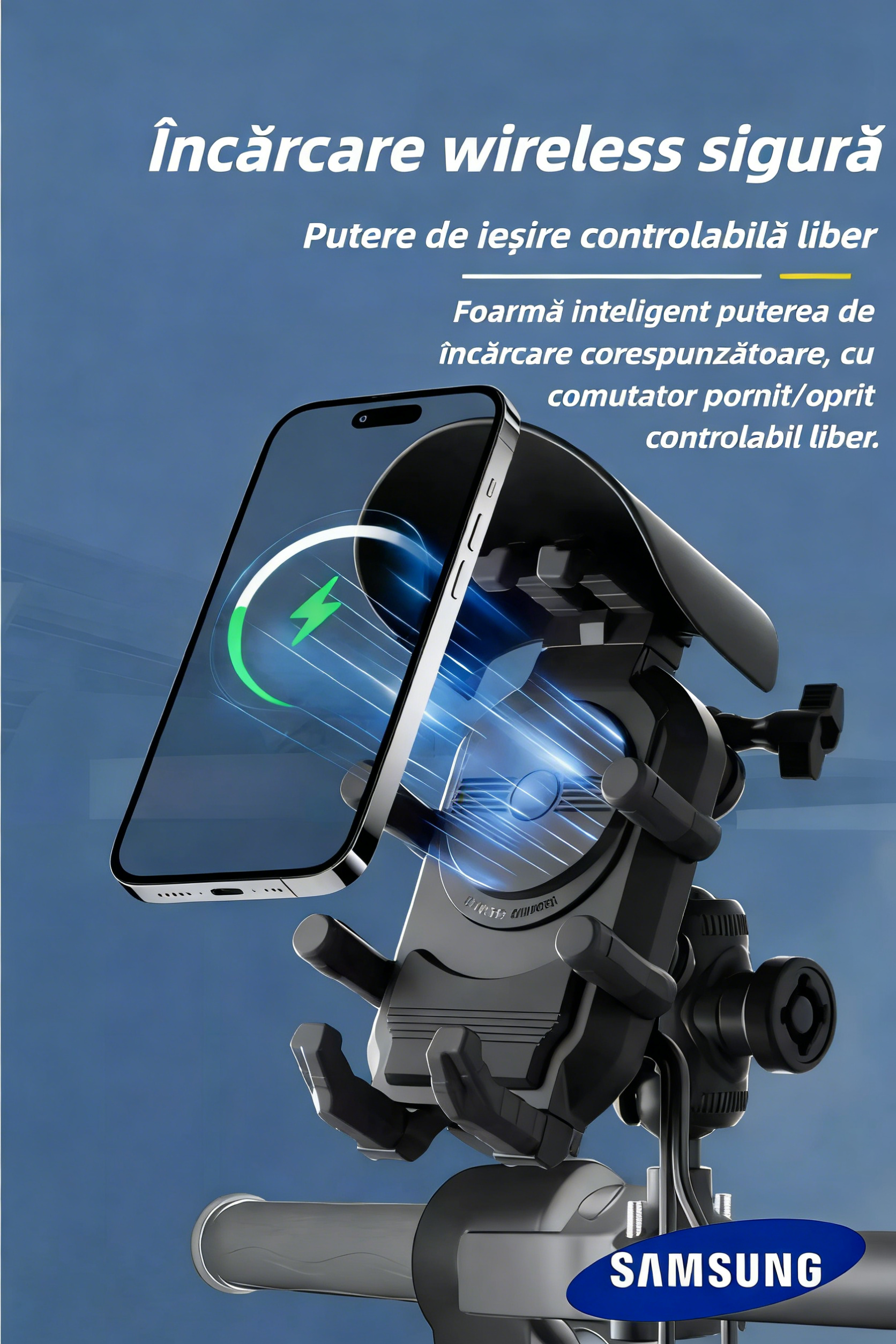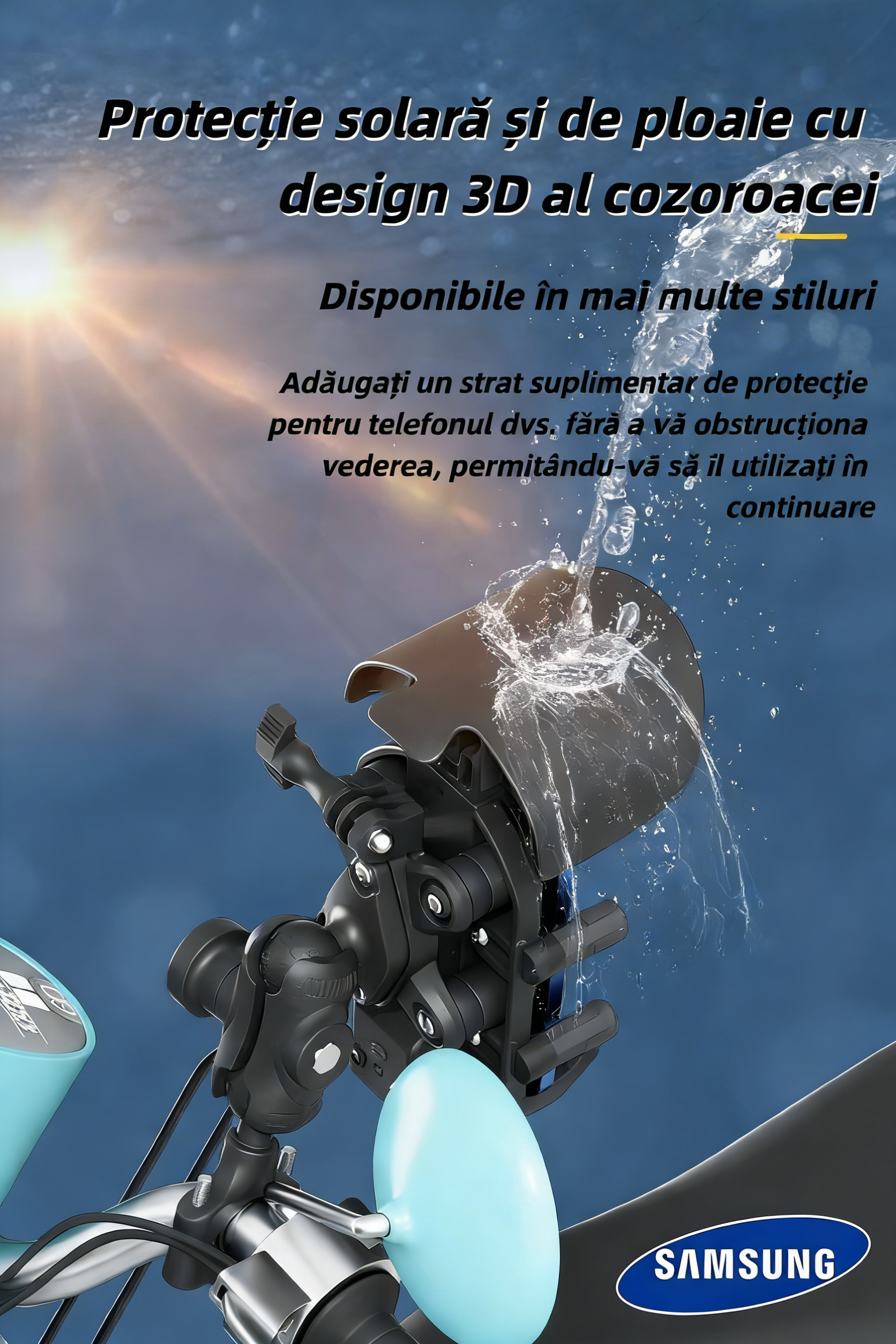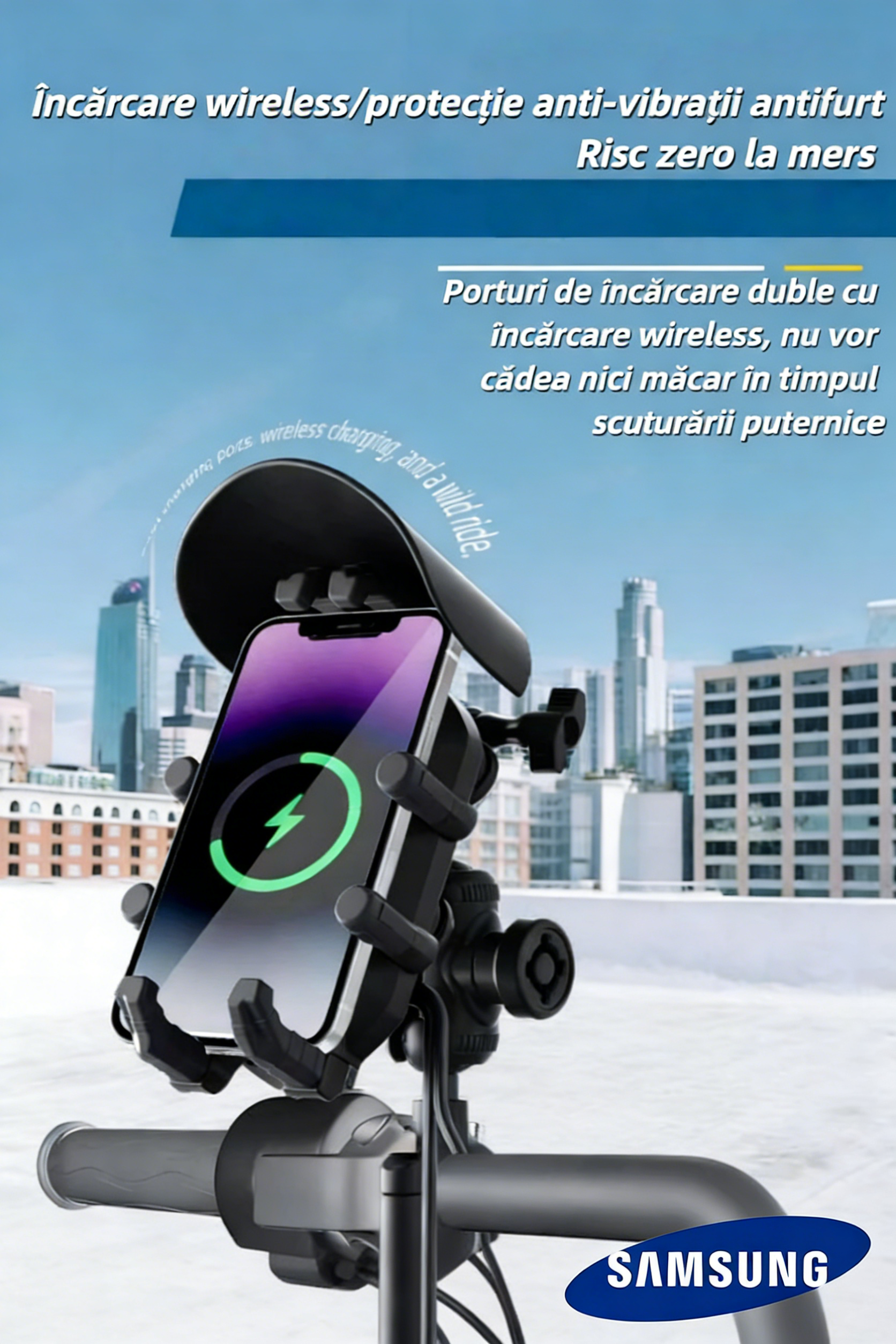 Suport pentru telefon Samsung moto 2026, rezistent la ploaie și zăpadă, cu protecție solară, rotire 360° și încărcare wireless